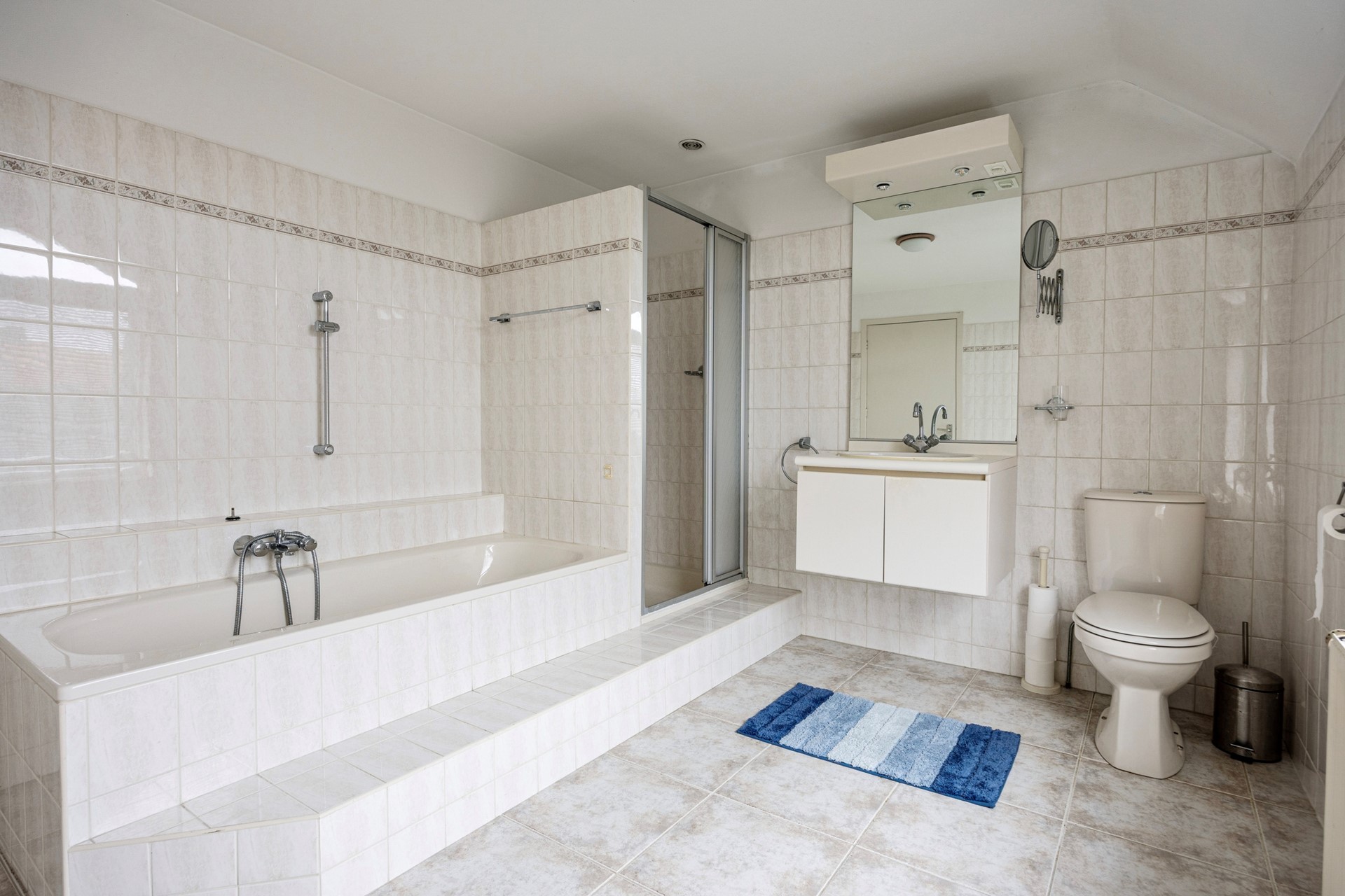 1e verdieping: ruime overloop, 2 ruime slaapkamers waarvan één met een airco, badkamer met een ligbad, douche, wastafelmeubel en 2e toilet.