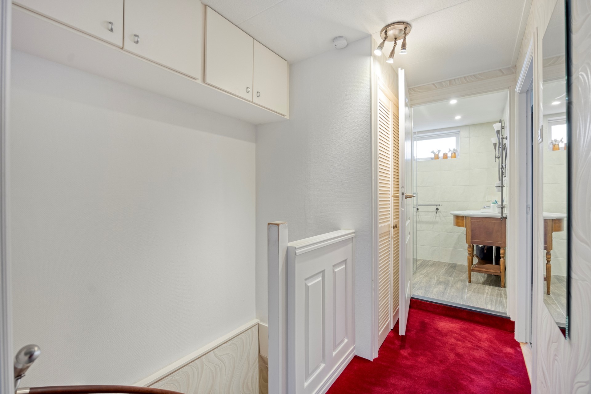 1e verdieping: overloop, 3 ruime slaapkamers, keurig onderhouden badkamer met een douche en wastafelmeubel.