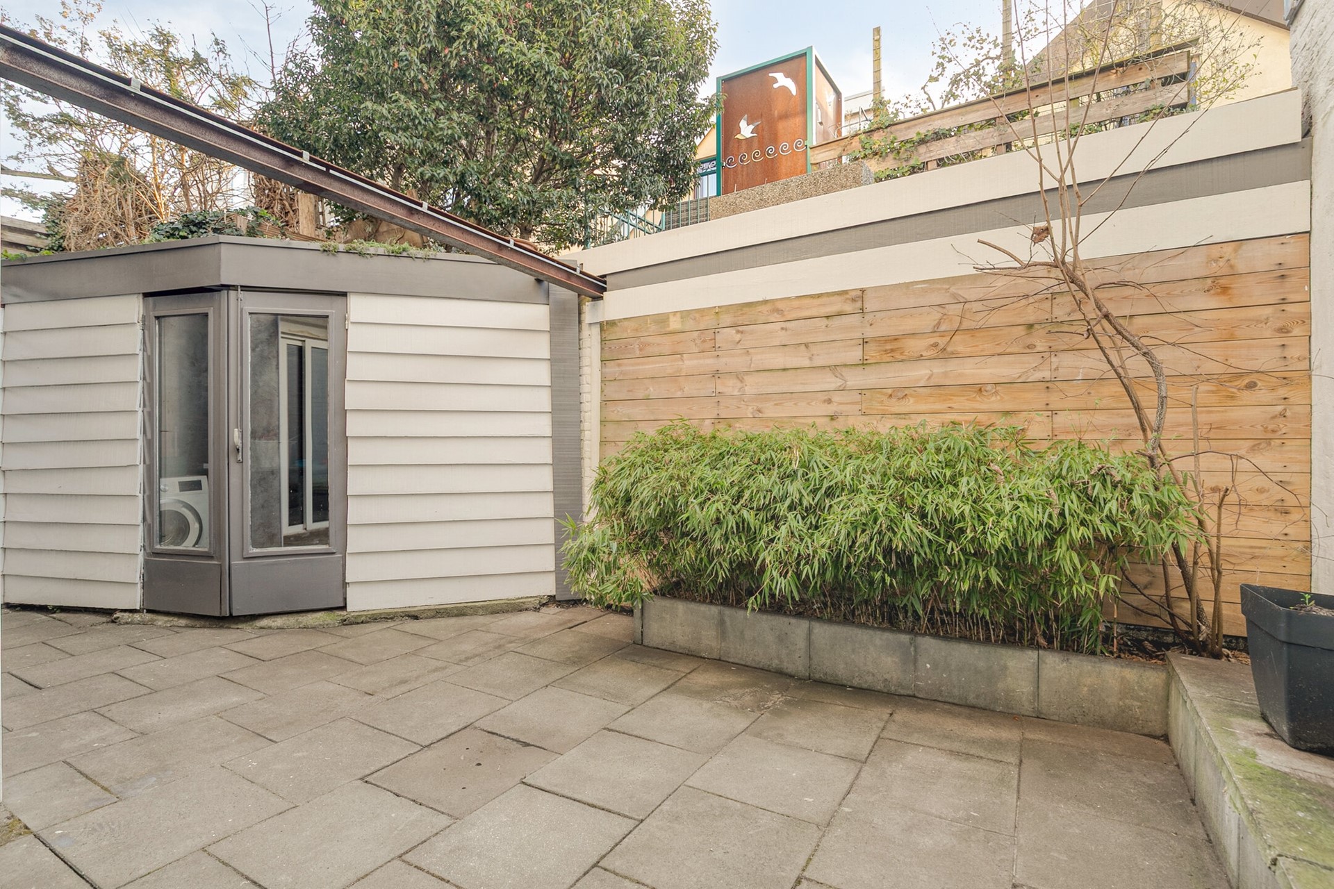 Begane grond: entree, hal met bergkast, ruime en lichte woonkamer, luxe open keuken met een kookeiland en diverse inbouwapparaten, een schuifpui naar de achtertuin/plaatsje (Z/O), slaapkamer met een vide en een kelder als inloopkast, moderne badkamer met een inloopdouche, wastafelmeubel en toilet. Er is tevens een vrijstaande houten berging, een poort naar de voorzijde en plek in de poort voor het stallen van een fiets.