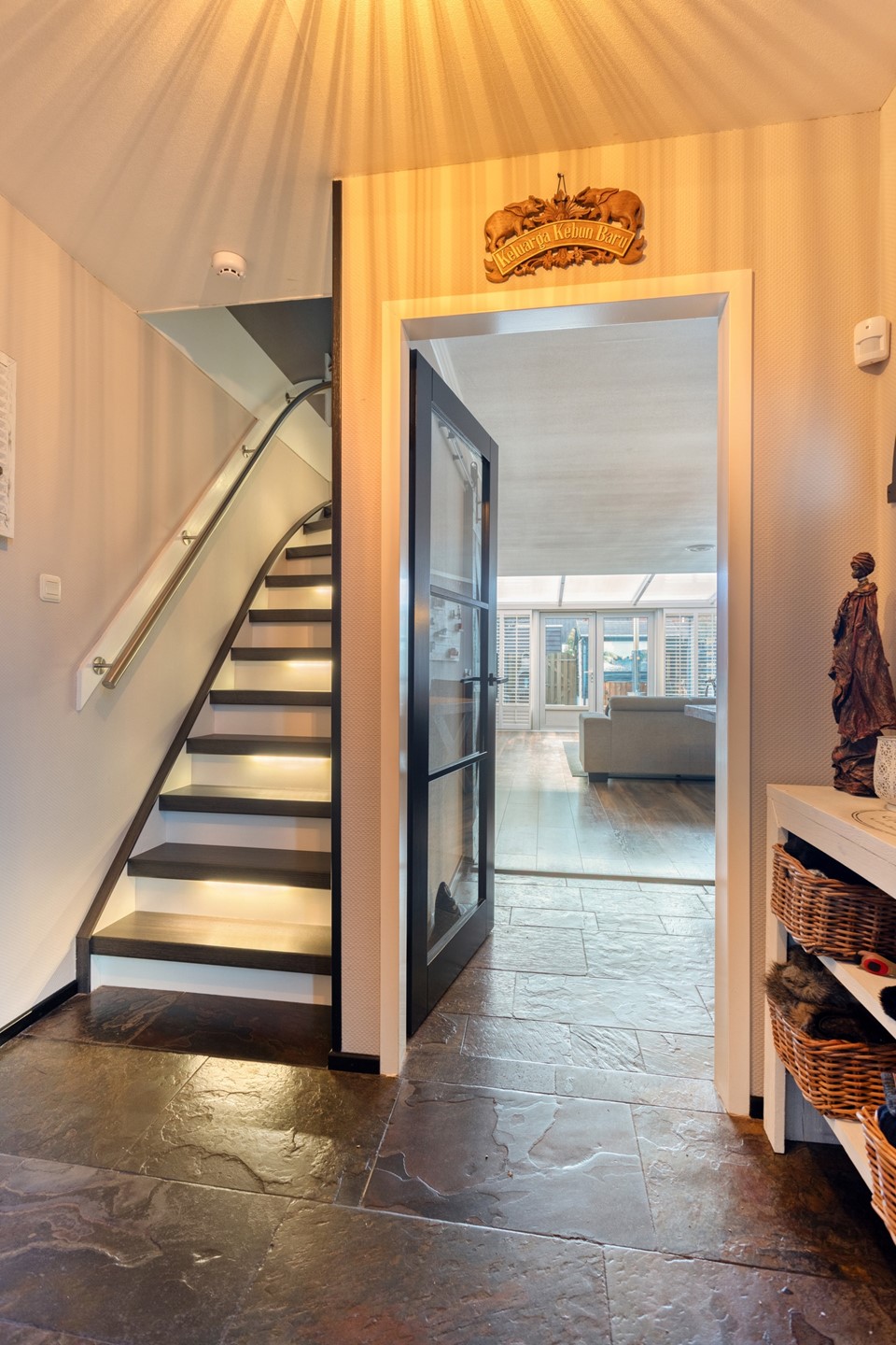 Begane grond: entree, hal met meterkast, toilet, trapkast, ruime en lichte woonkamer met een royale uitbouw met serredak, L-vormige keuken met diverse inbouwapparaten, openslaande deuren naar de zonnig gelegen achtertuin (Z/O) met elektrische zonwering, vrijstaande houten berging en achterom. Tevens is er aan de voorzijde een aangebouwde stenen berging.
