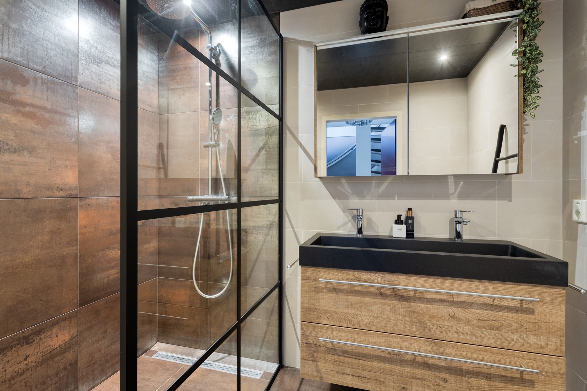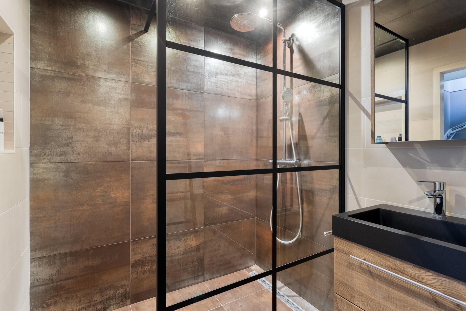 1e verdieping: ruime overloop, 3 ruime slaapkamers waarvan één met een vaste kast, moderne badkamer met een inloopdouche, dubbel wastafelmeubel en 2e toilet.