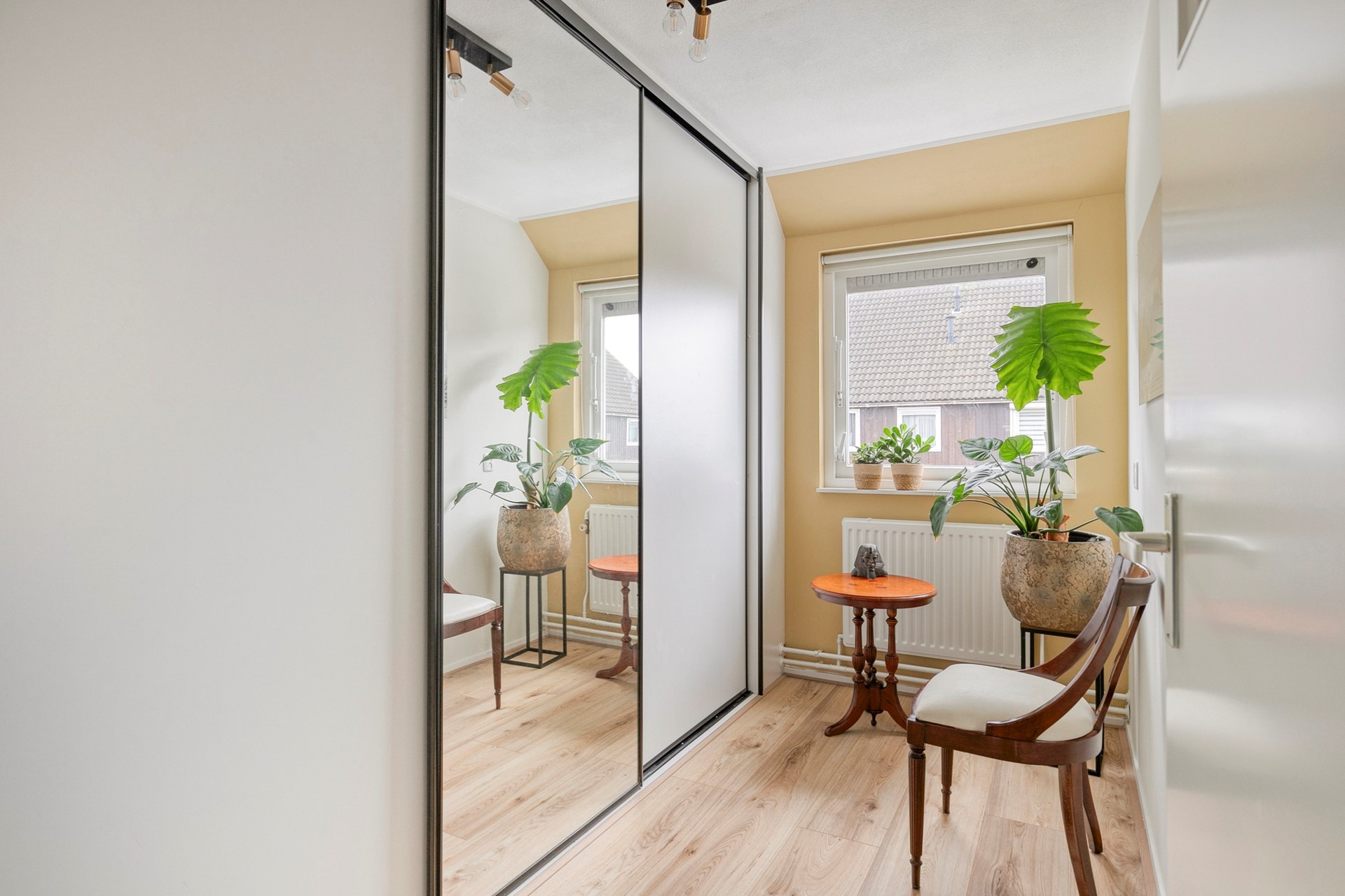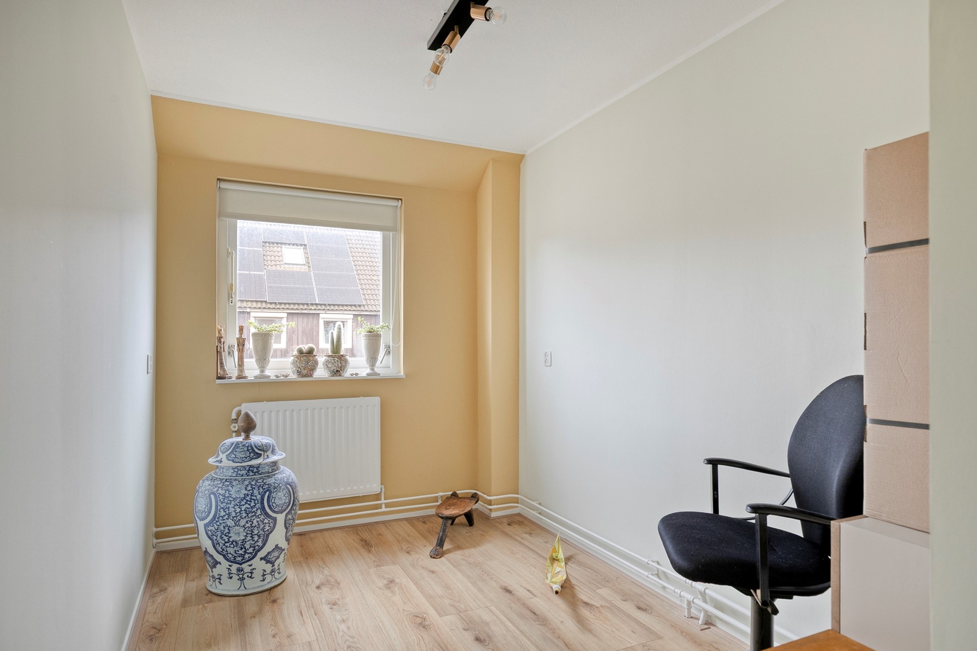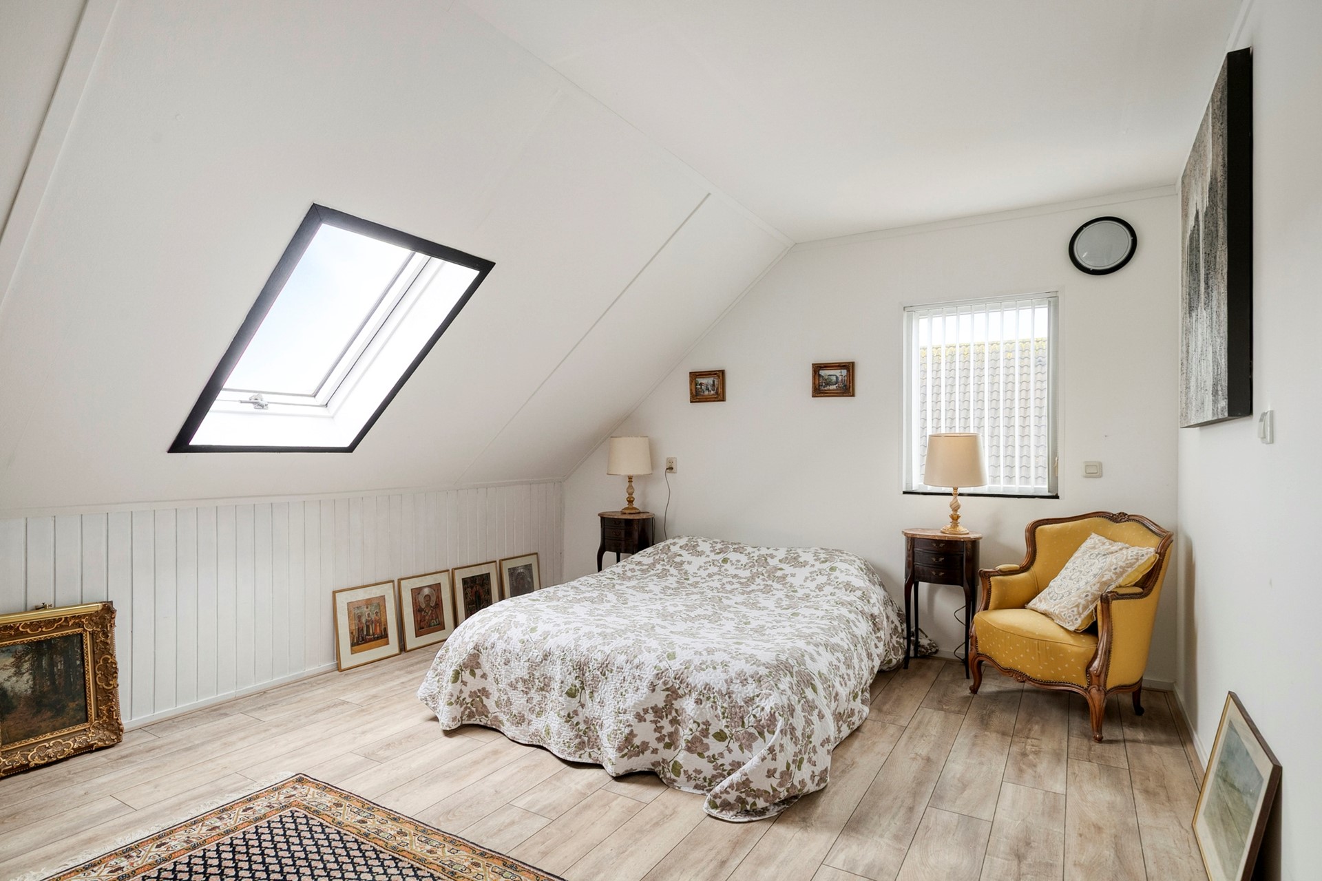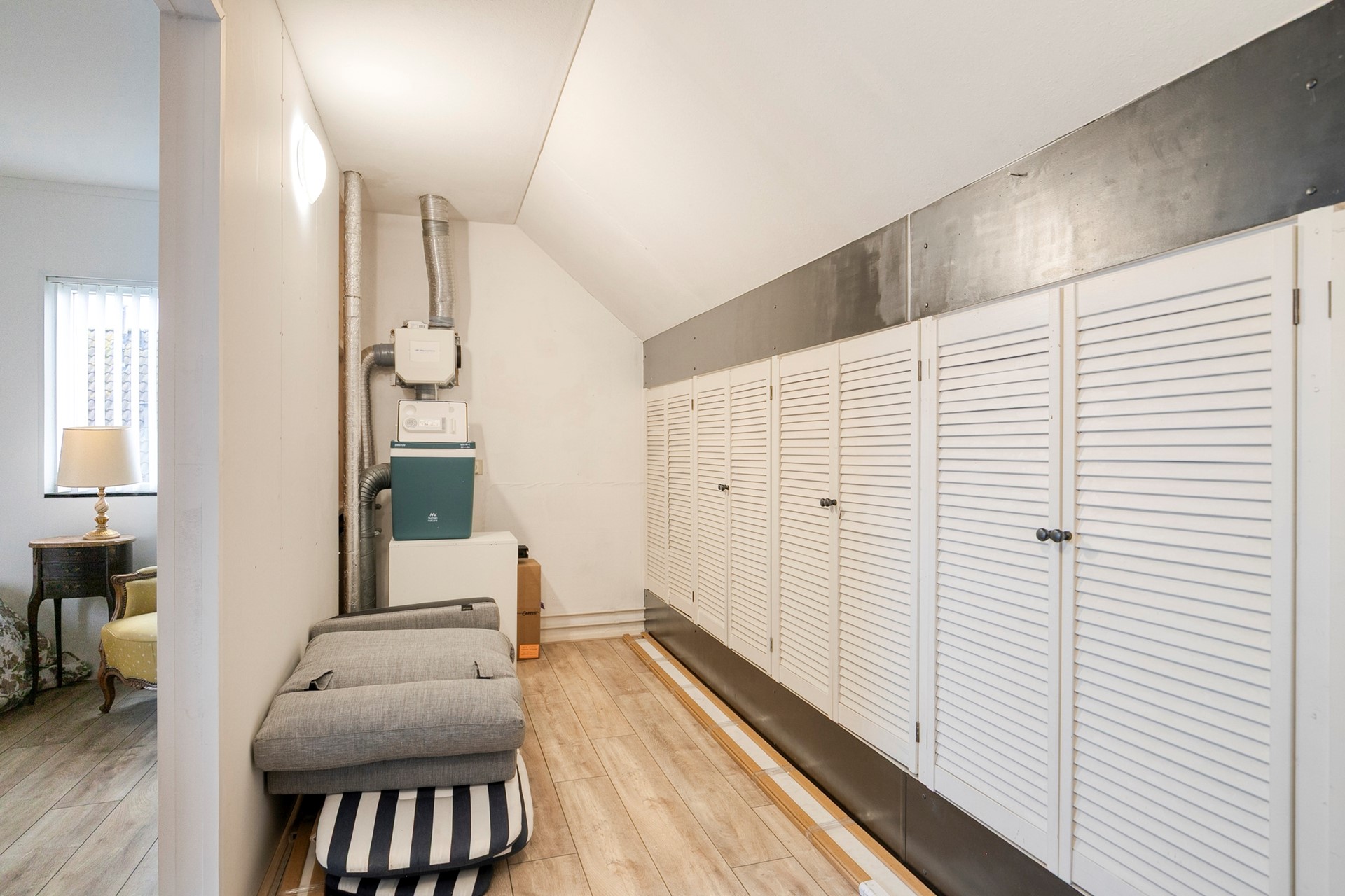 2e verdieping: ruime 5e slaapkamer met een dakraam en een schuifdeur naar de bergkamer met bergruimte in de knieschotten en opstelplaats CV-ketel en mechanische ventilatiebox.